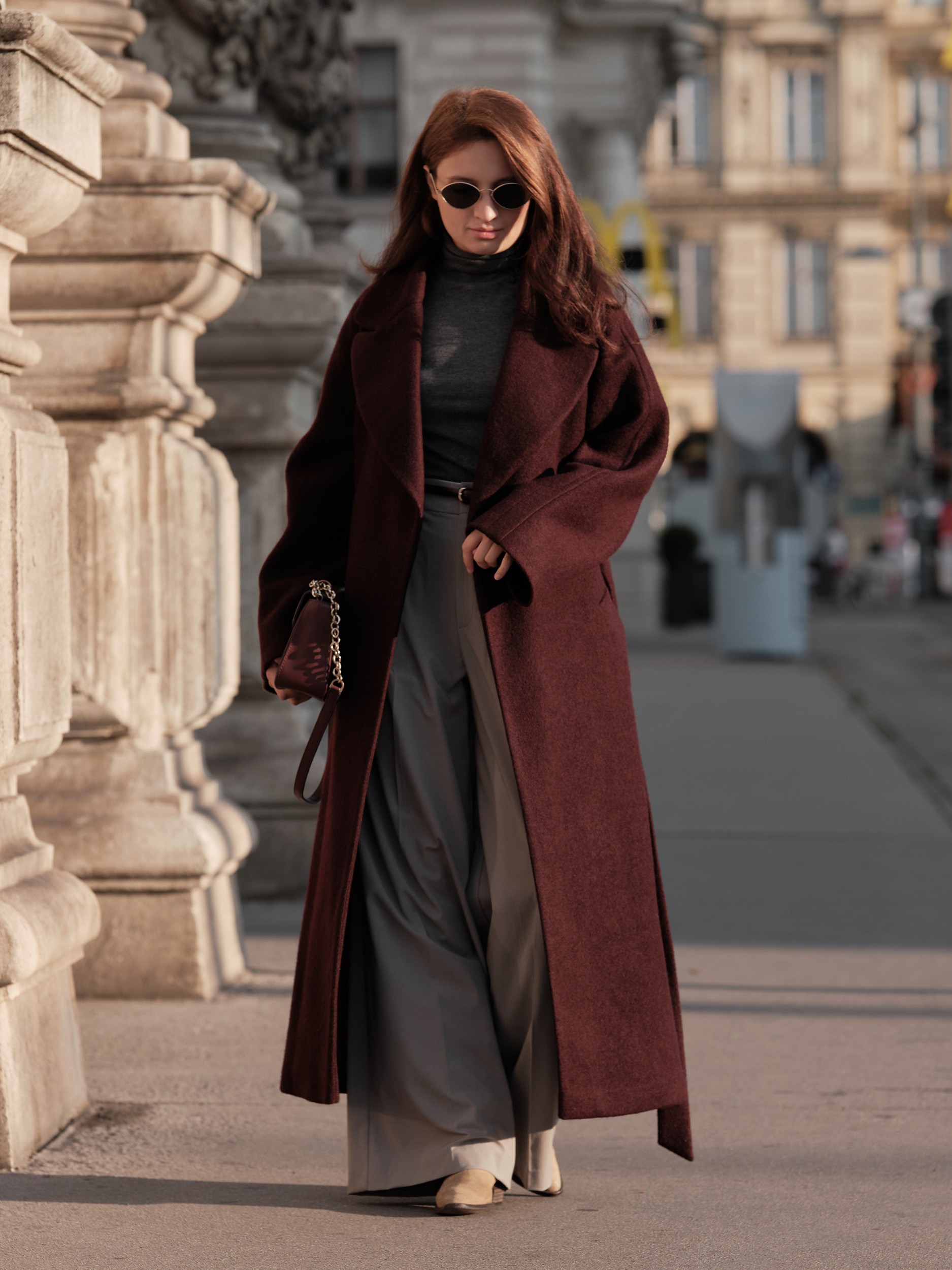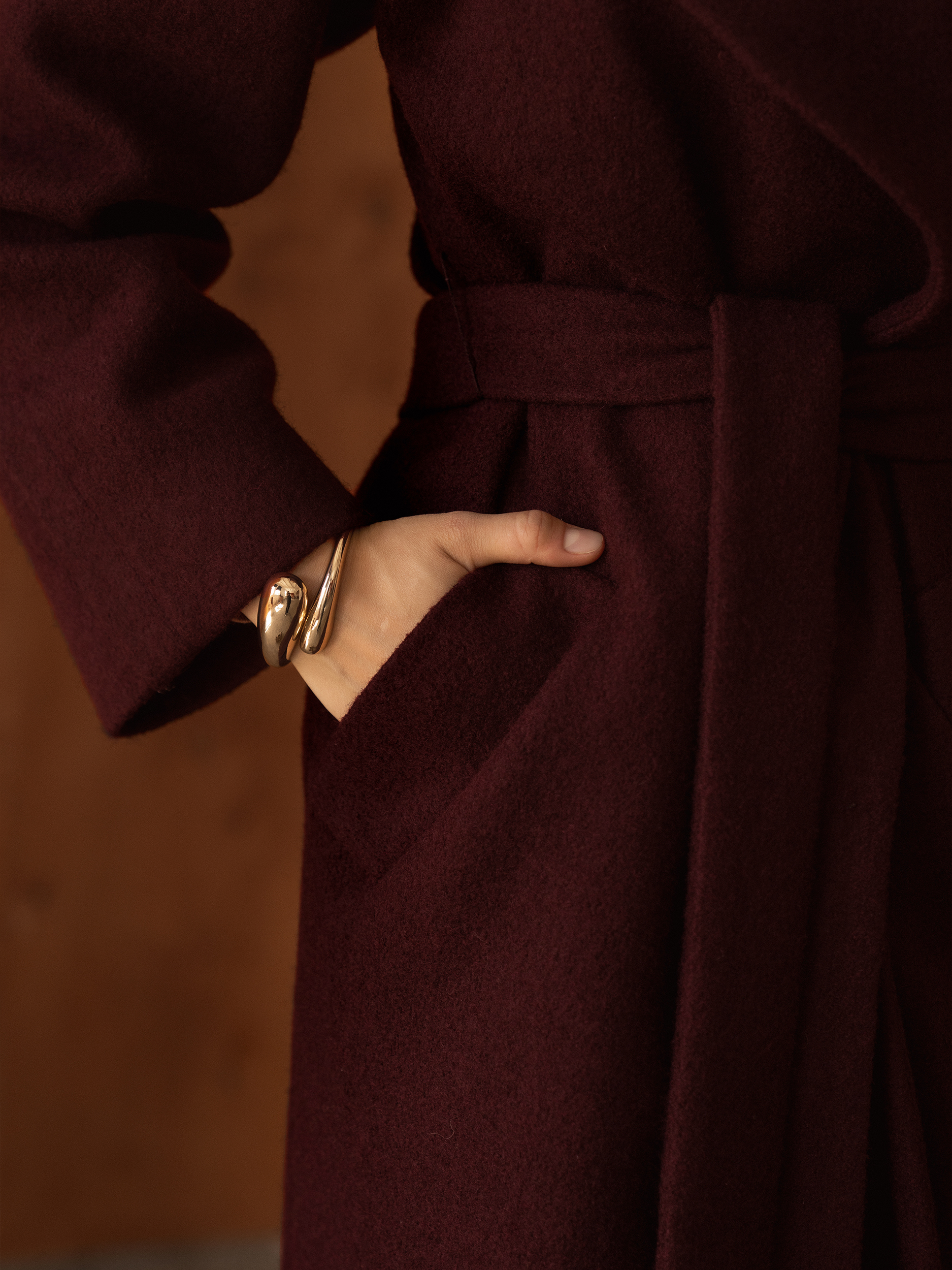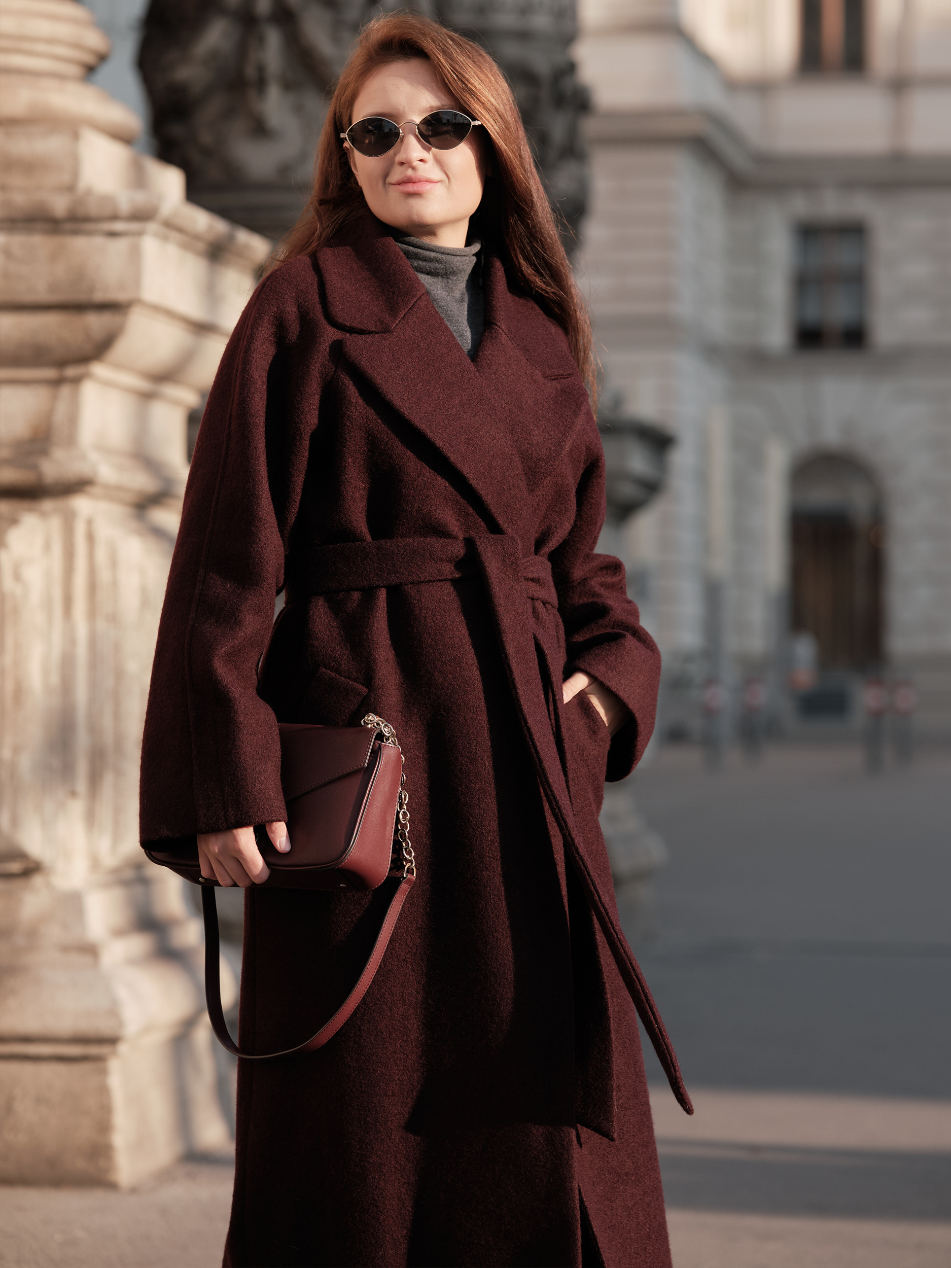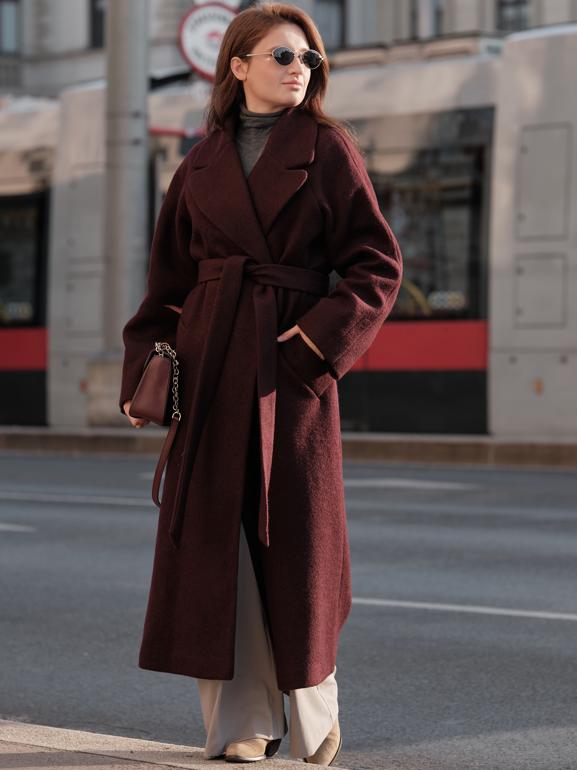 Доповніть свій гардероб елегантним бордовим пальтом вільного крою, яке стане справжньою родзинкою вашого образу. Це довге вовняне пальто поєднує класику, стиль і комфорт. Виготовлене з преміальної тканини з вовною та кашеміром, воно забезпечує м’якість, тепло та довговічність.