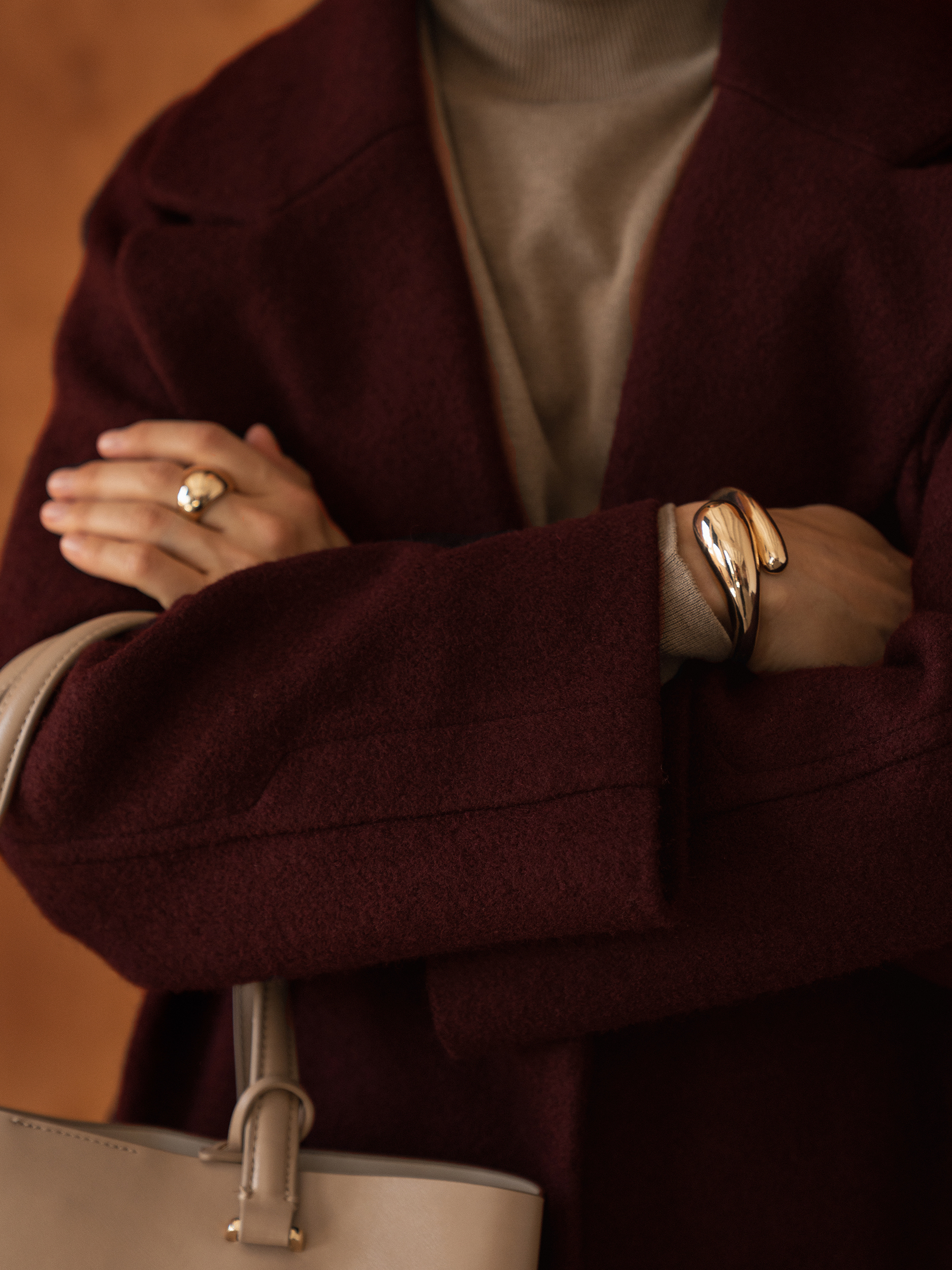 Це двобортне пальто бордового кольору стане ідеальним вибором для будь-якої події – від прогулянки містом до офіційної зустрічі. Завдяки продуманому дизайну його можна легко комбінувати з джинсами, класичними брюками або сукнею.