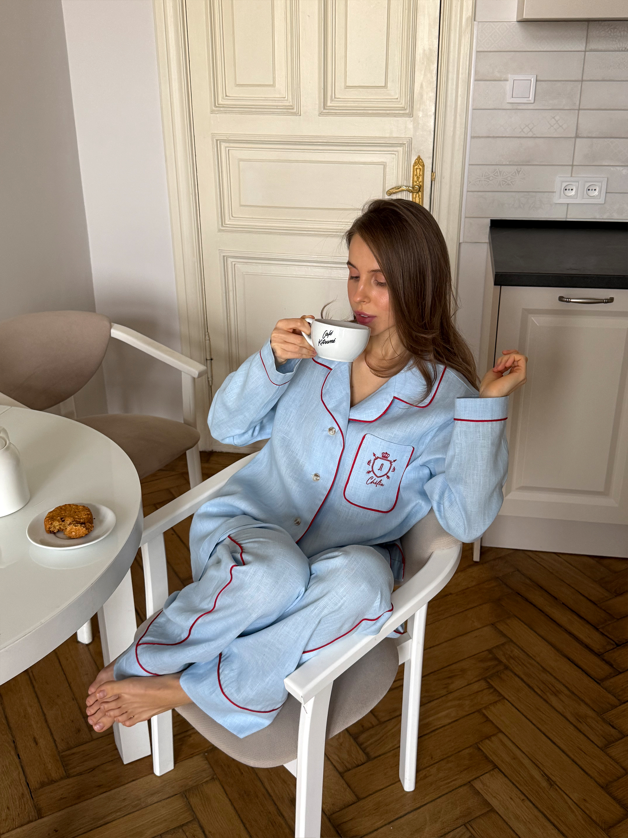 Блакитна піжамна сорочка CHELIE — це ніжність дотику та естетика у кожній деталі. Виконана з 100% натурального льону, вона дозволяє тілу дихати, даруючи відчуття легкості навіть у найспекотніші дні.