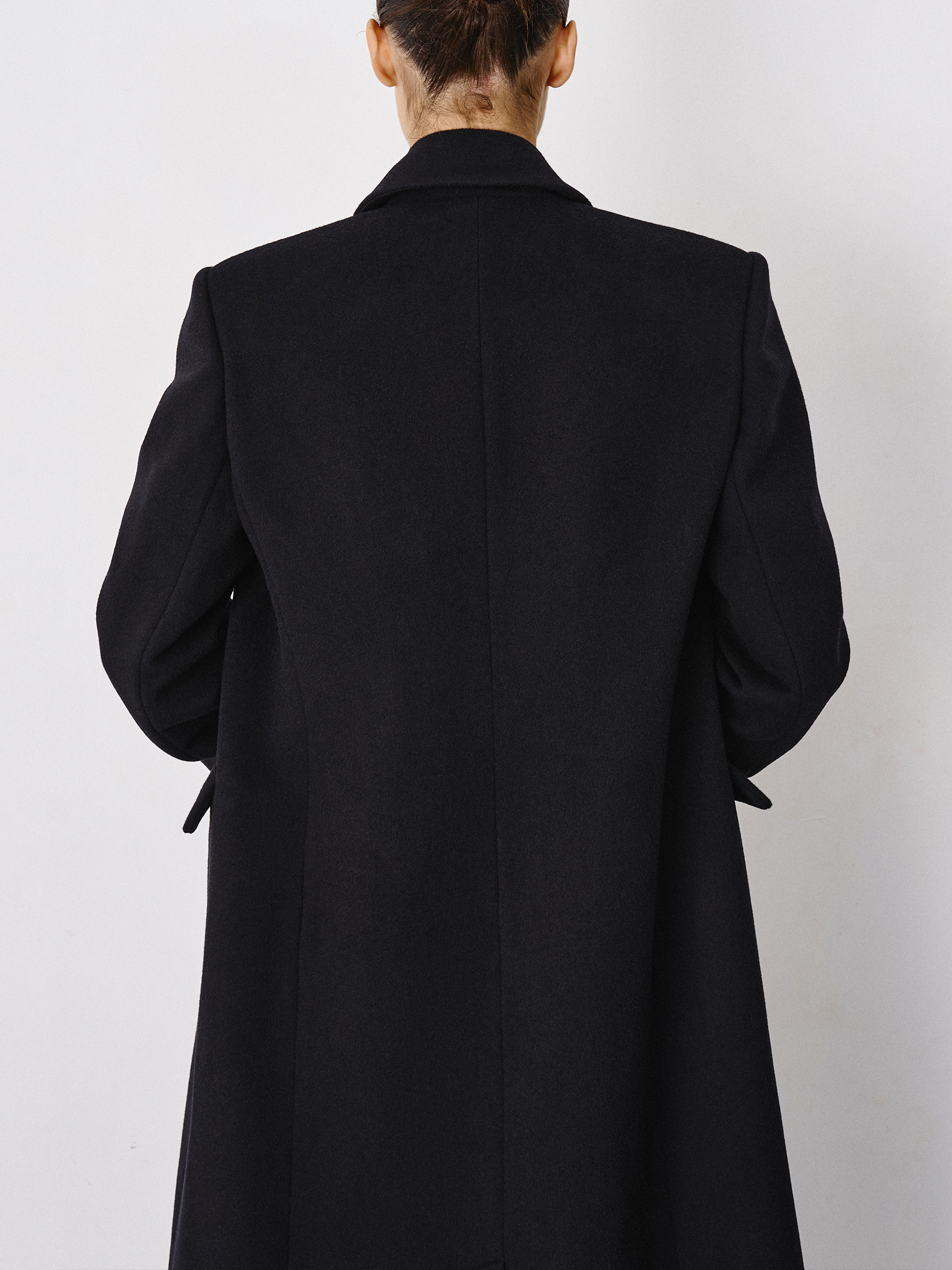 Пальто створене з щільної вовняної тканини, яка надійно зігріває в осінньо-зимовий період. Втачні рукава забезпечують точну посадку по плечах, а вільна форма дозволяє поєднувати виріб із різними шарами одягу — від сорочок до об’ємних светрів.
