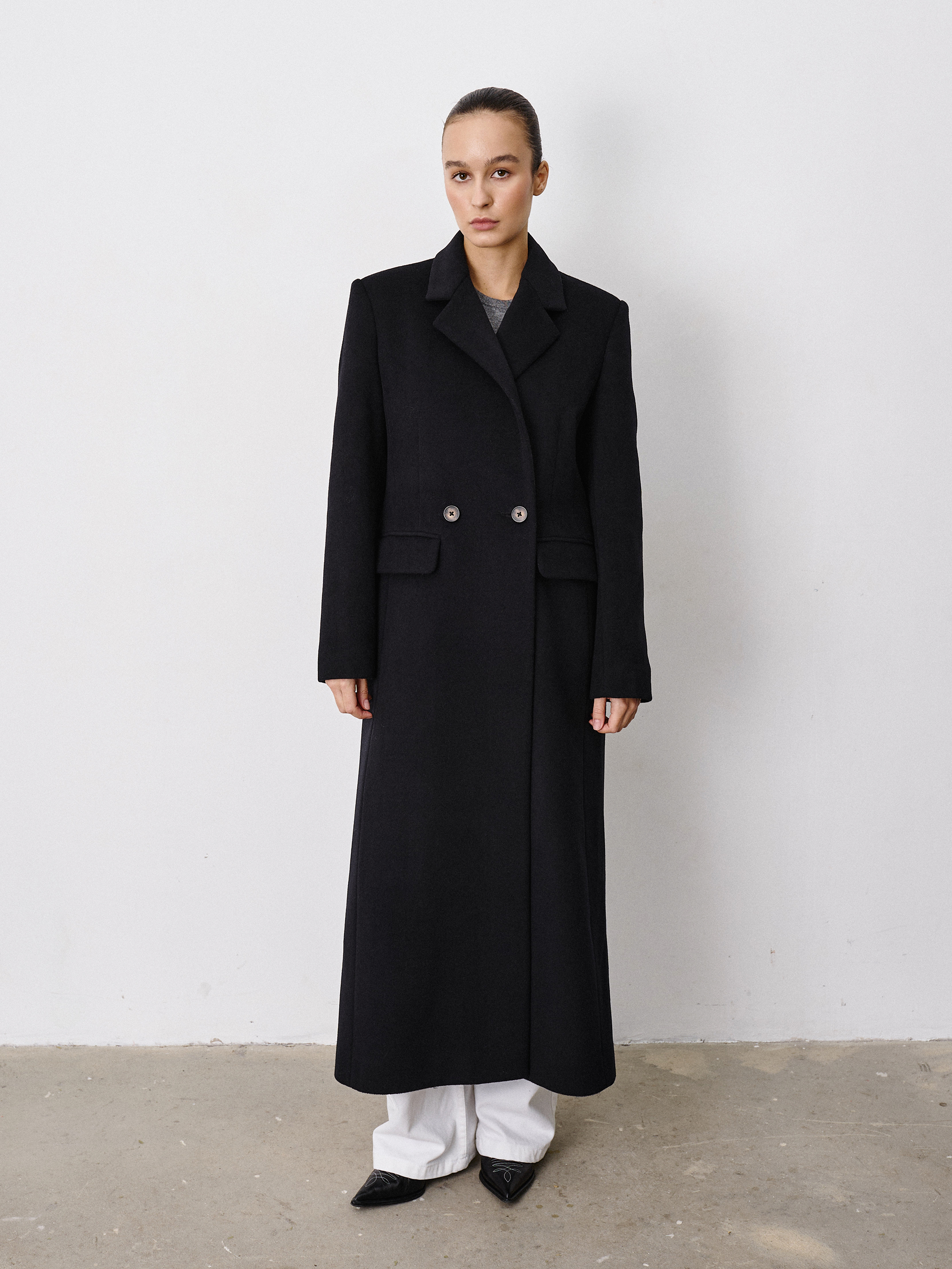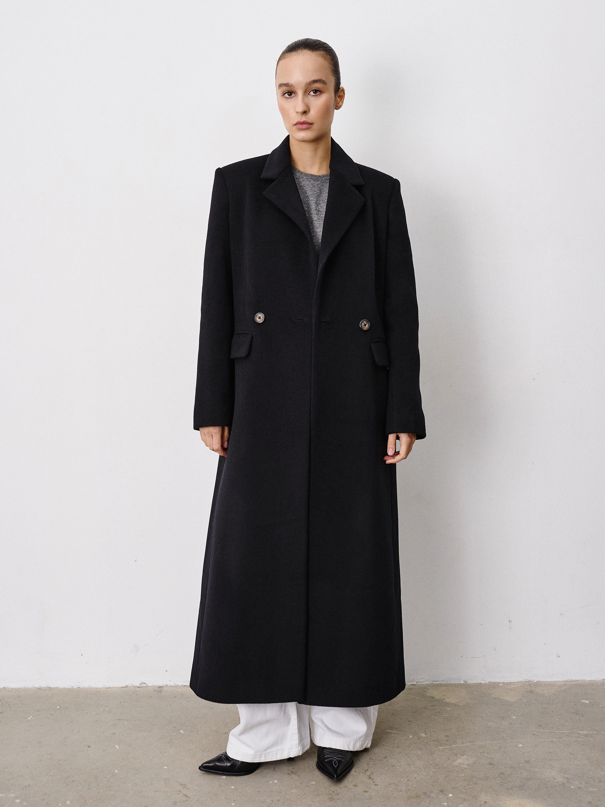 Чорне пальто від CHELIE — це сучасна інтерпретація класичного чоловічого крою у жіночому гардеробі. Його двобортний силует підкреслює структуру образу, надаючи впевненості та елегантності.