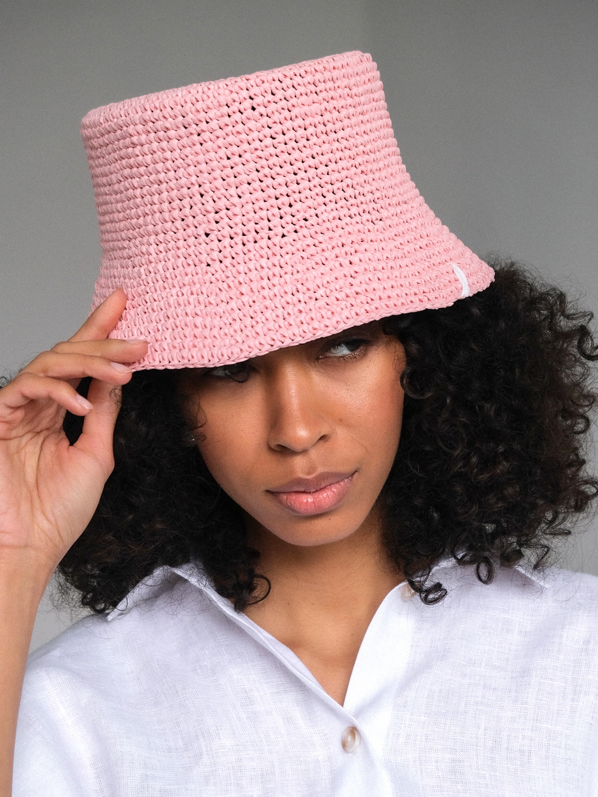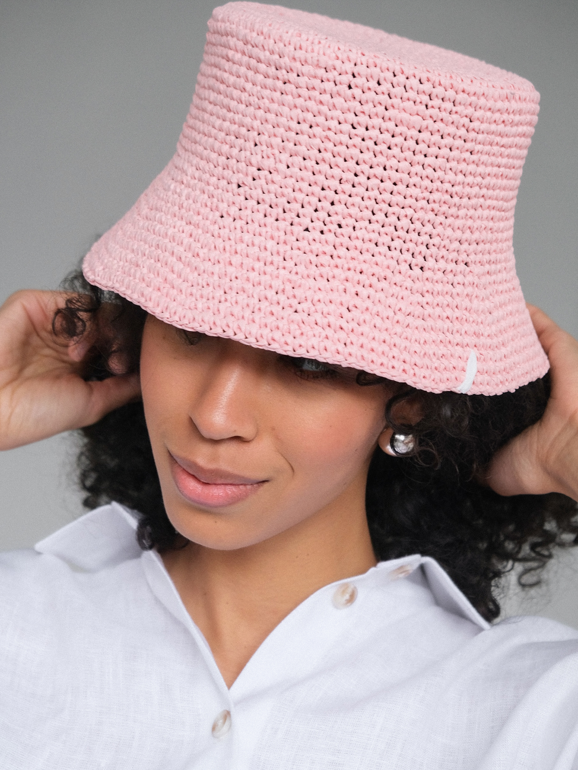 Рожева панама CHELIE — витончений літній акцент у ніжному пудровому відтінку. Виготовлена зі 100% натуральної рафії вручну, вона має пластичну форму, що комфортно адаптується до голови та зберігає структуру. Ідеальна для міських прогулянок, подорожей і легких сезонних образів.