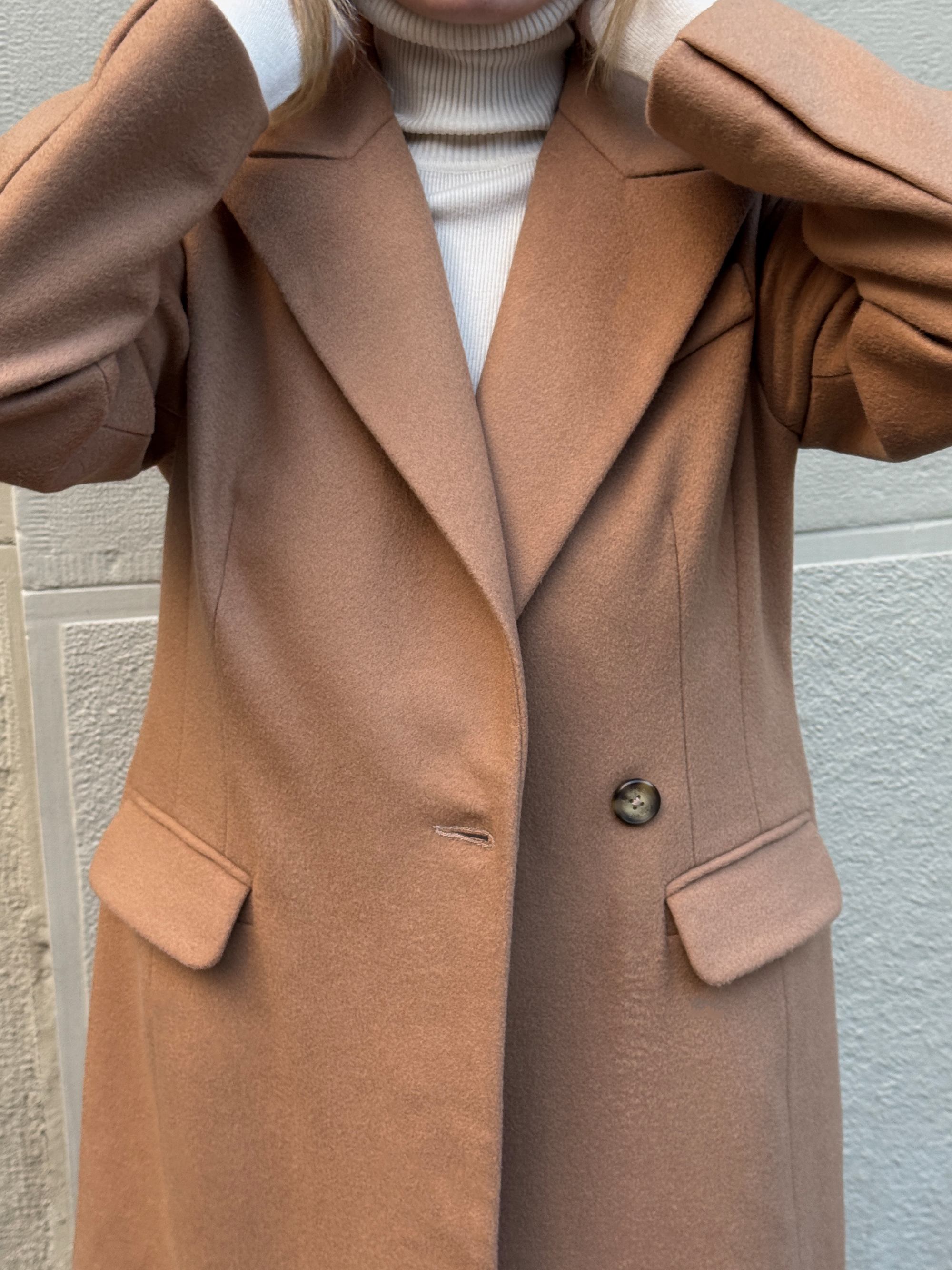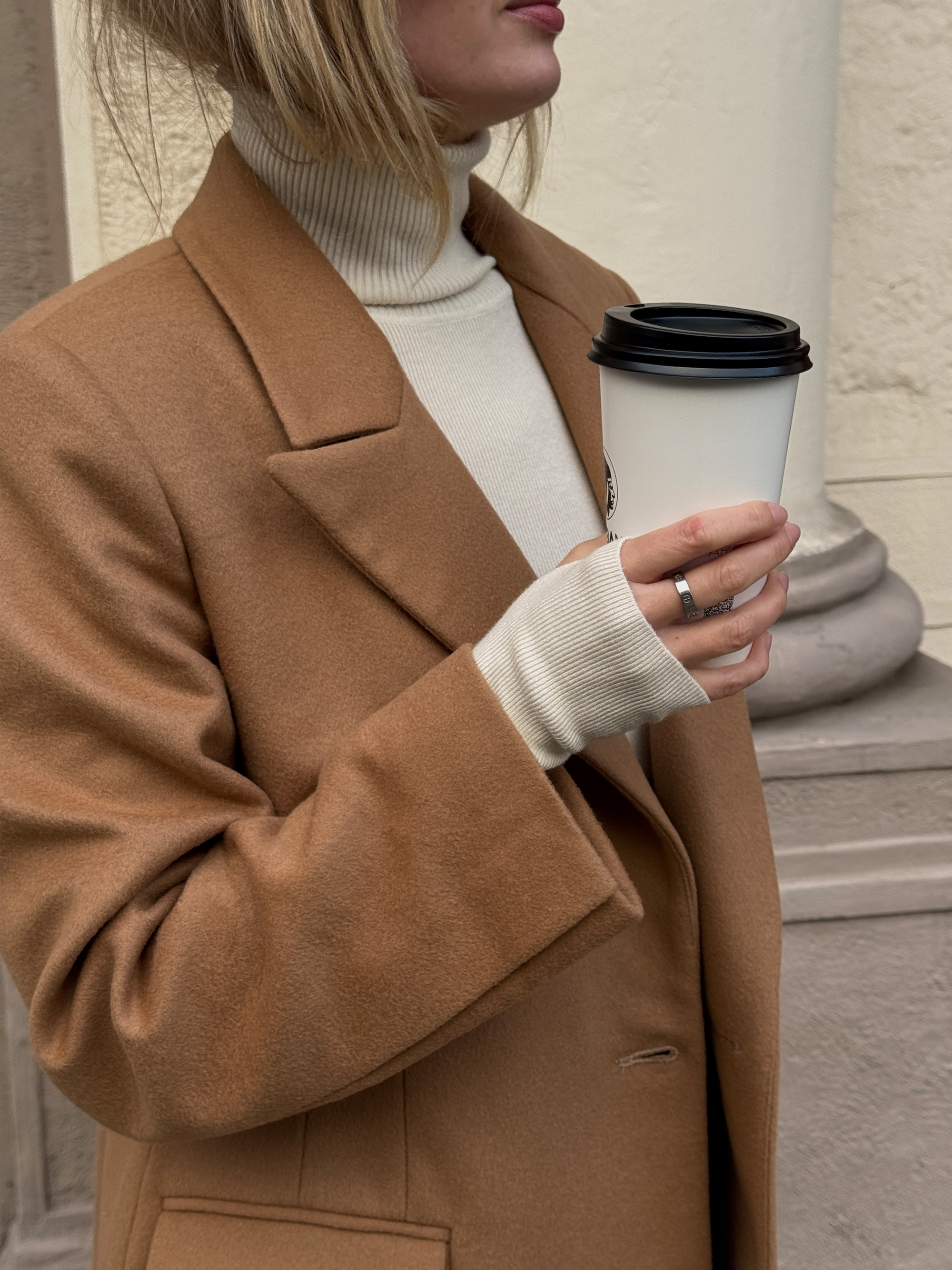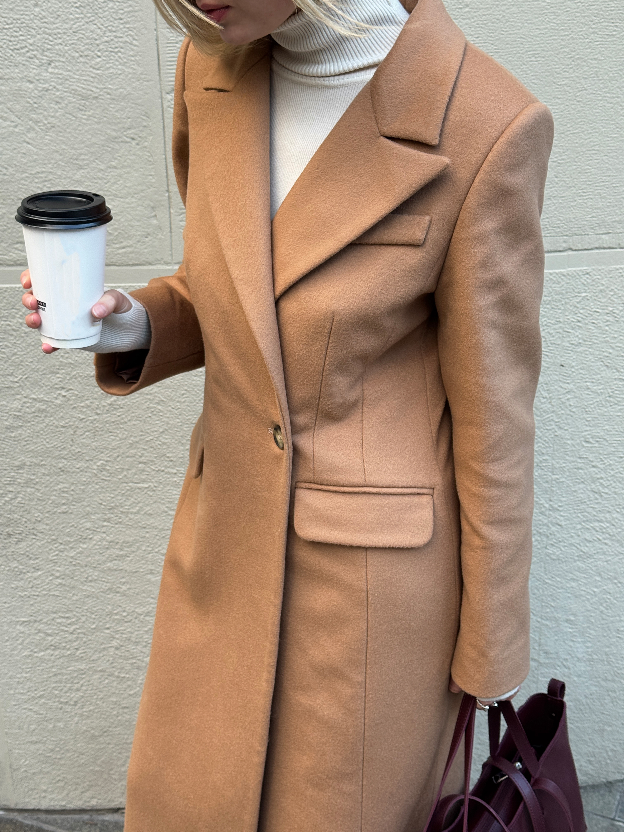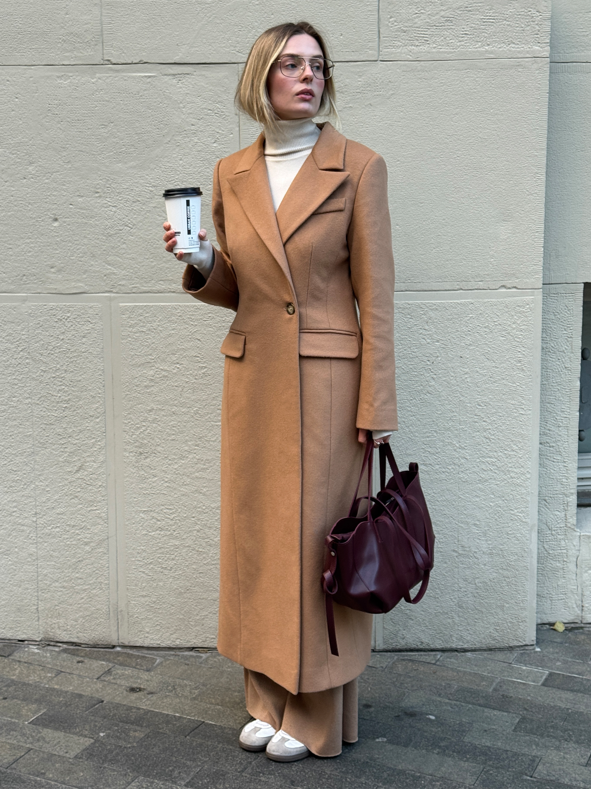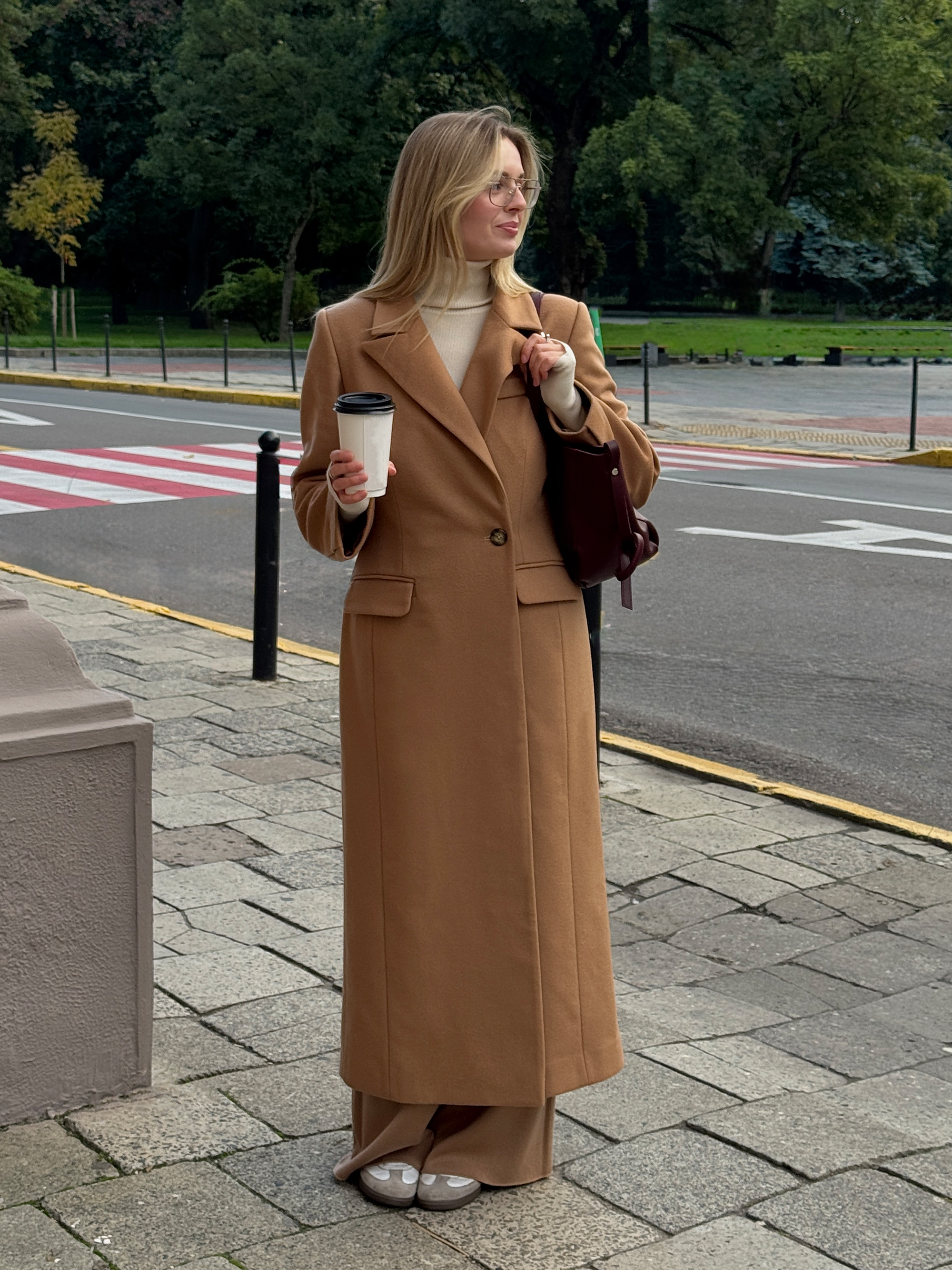 Бежевий відтінок надає моделі м’якого, нейтрального звучання, яке пасує до будь-якої палітри гардероба. Завдяки довжині 130 см пальто створює витягнутий силует, додає впевненості і чудово поєднується як з чоботами, так і з лоферами.